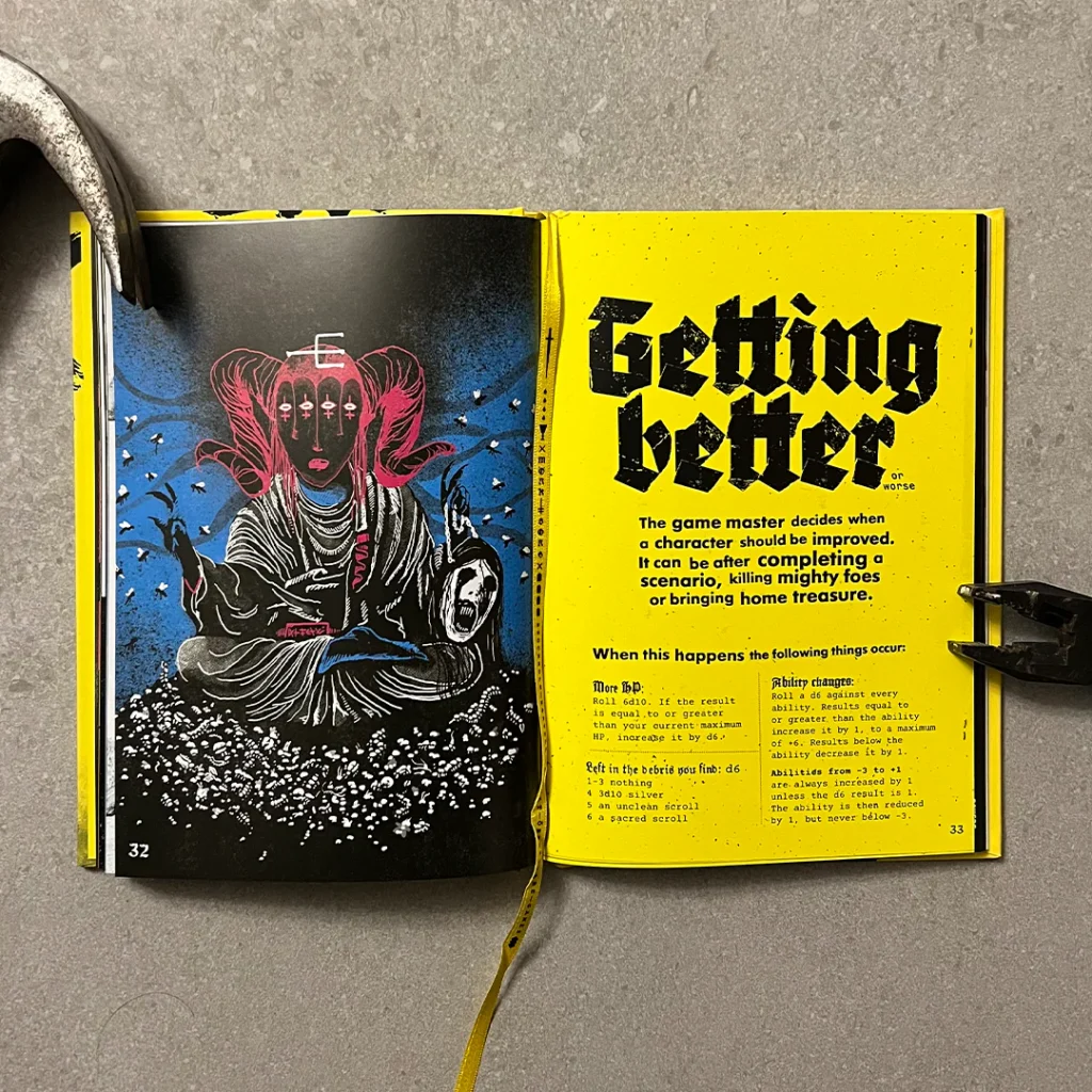 MÖRK BORG te sumerge en un mundo que se está yendo literalmente al carajo; el apocalipsis es inminente y la salvación es imposible. Aquí no hay héroes, sino scvm (escoria), carroñeros que buscan atiborrarse de los restos de un continente moribundo. El libro en sí mismo es una obra de arte, con un diseño intencionalmente caótico, a todo color, que recuerda a un álbum de doom metal o a un «manuscrito prohibido». Su edición física es de lujo, incluso con tapas suaves y aterciopeladas, y letras que brillan muy tenuemente en la oscuridad.